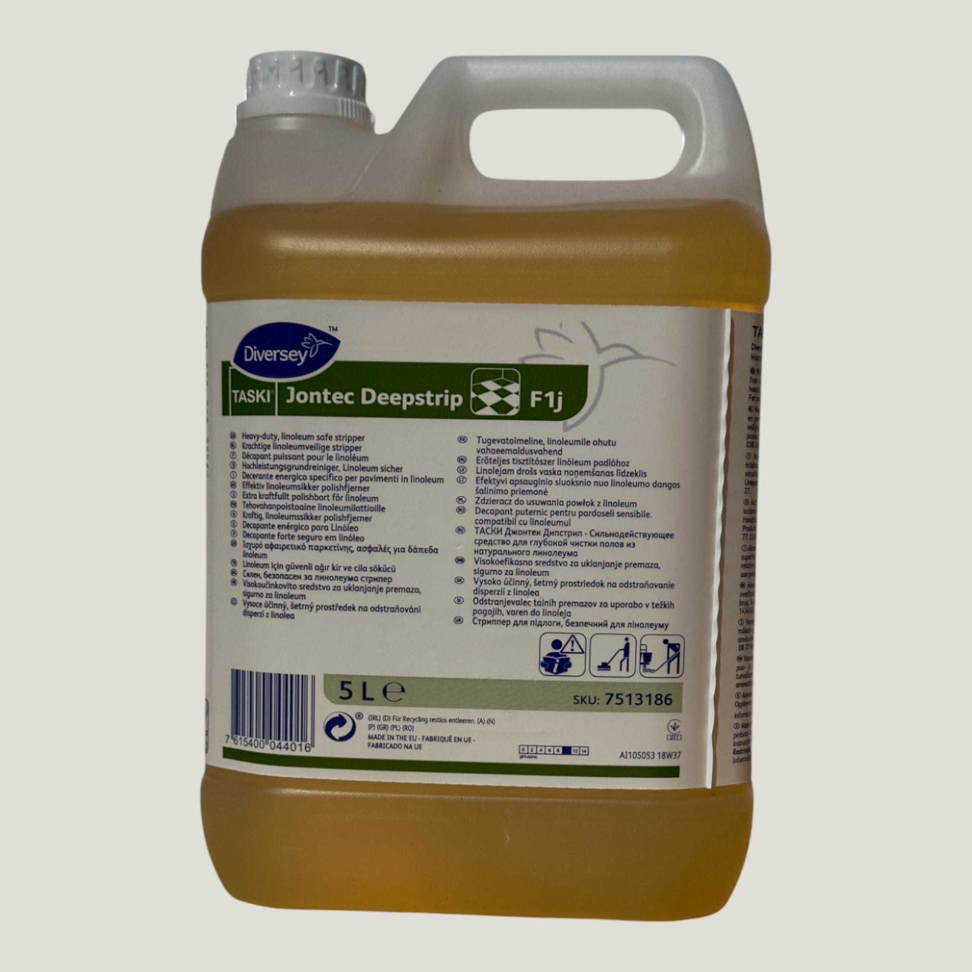 TASKI Jontec Deepstrip F1j is een krachtige, oplosmiddelhoudende stripper die speciaal is ontwikkeld voor het verwijderen van waslagen en onderhoudsfilms van linoleum en andere waterbestendige harde vloeren. Het product is effectief in het snel en volledig verwijderen van beschermende lagen, terwijl het de kleuring van linoleumvloeren respecteert, zelfs bij oudere vloeren. Dankzij de licht alkalische formule en lage schuimvorming is het veilig en eenvoudig in gebruik. TASKI Jontec Deepstrip F1j kan worden toegepast met een mop, schrobzuigmachine of eenschijfsmachine, afhankelijk van de behoeften van de gebruiker.